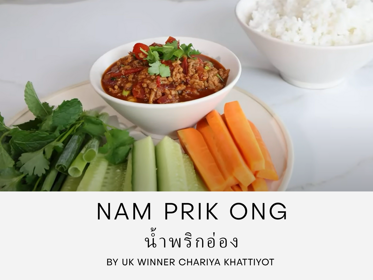Nam Prik Ong is a popular Thai dip or chili relish from northern Thailand, especially in Chiang Mai. It’s made primarily from minced pork, tomatoes, and a spicy chili paste, creating a rich, savory flavor with a hint of sweetness and spice. Traditionally, the chili paste is made by pounding dried chilies, garlic, shallots, and fermented shrimp paste (or fish sauce) together, then cooking it with the pork and tomatoes until the flavors meld into a thick, aromatic mixture. Nam Prik Ong is typically served with fresh vegetables like cucumber, cabbage, long beans, and herbs, and sticky rice or pork rinds. It’s known for being a crowd-pleaser and often enjoyed as an appetizer or part of a larger Thai meal.